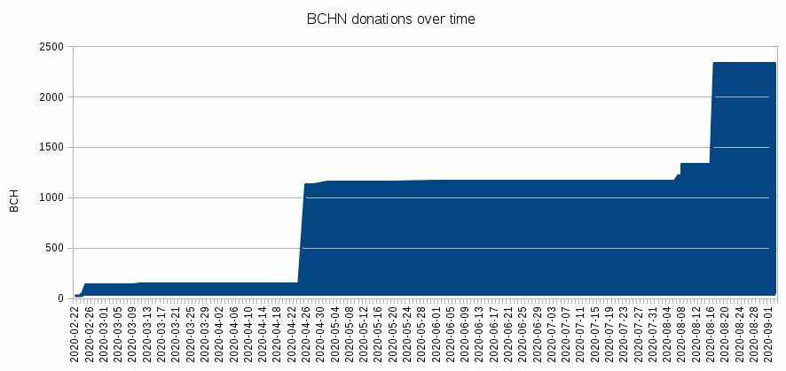 A total of 2333.89044513 BCH had been received in donations since the start of the project in February 2020. About half of that was raised via a Flipstarter campaign which successfully completed on