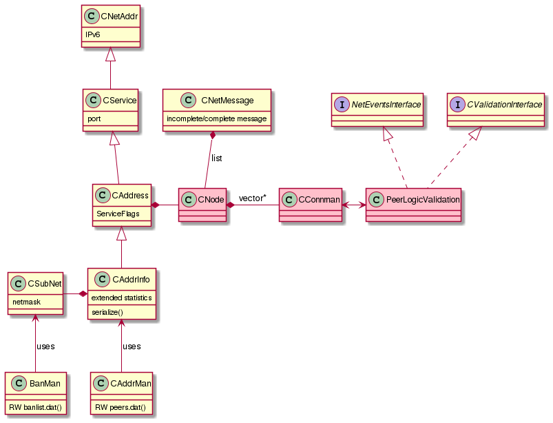 The above image presents the relevant classes and their interactions. The most important are figured in pink.